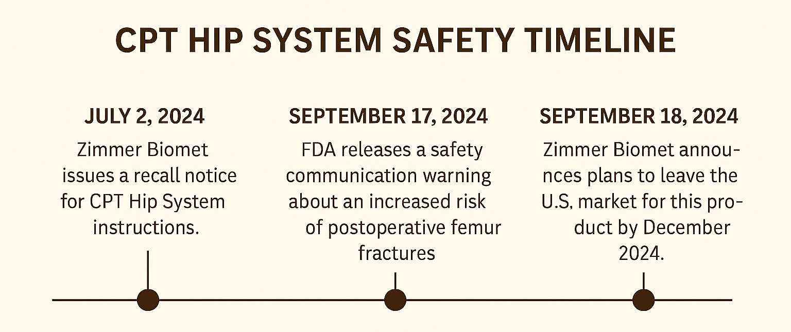 In July 2024, Zimmer Biomet issued a recall related to the instructions for its CPT Hip System Femoral Stem. New research revealed that patients implanted with this device are more than twice as likely to suffer a thigh bone fracture compared to patients with other hip implants.